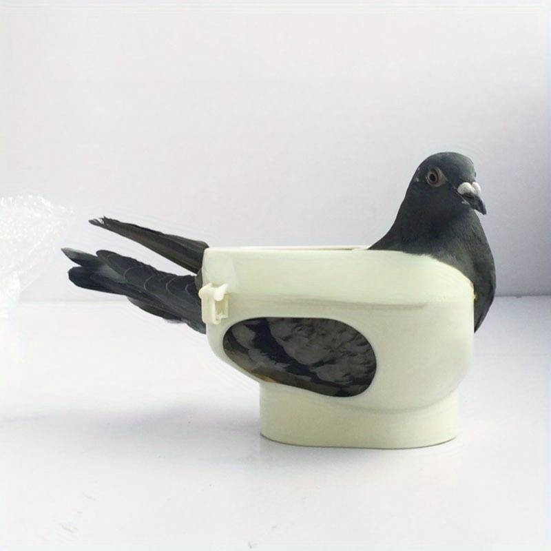 Suport de porumbei pentru tratament, vaccin sau hranire. Suportul nu permite porumbelului sa se miste sau sa se zbata. Materialul este din plastic rezistent (partea de sus se deschide, sistem de inchidere). Capul si coada porumbelului sunt iesite din suport. Suportul este incapator pentru orice rasa de porumbel.